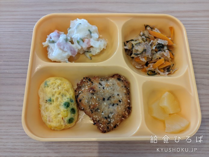 海苔ごまチキン&彩オムレツ、ポテトサラダ、豚キムチ、パイン缶、白飯、牛乳