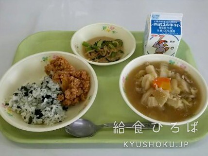 今日の給食は、若布ごはん、すいとん汁、味噌ポテト、小松菜の胡麻和え、牛乳です。