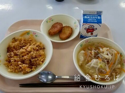 今日の給食は、キムチご飯、ワンタンスープ、大豆ナゲット、牛乳 です。