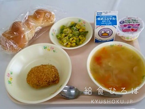 今日の給食は、ツイストパン、ABCスープ、メンチカツ、野菜ソテー、ベリーゼリー、牛乳 です。