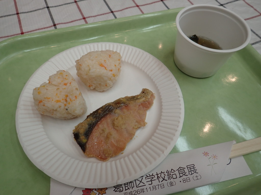 OLYMPUS DIGITAL CAMERAそして、学校給食の試食もありました。 「和食でおもてなし」がテーマです。 ニンジンが入ったまぜご飯、「もみじご飯」のおむすび、秋が旬の鮭のみそ焼き、たくさんの具が入った沢煮椀をいただきました。 小学校中学年の普段の量の半分ということでしたが、同じく試食用に準備していたパンが早々になくなったということで、おむすびを2こいただいてしまいました。 ごちそうさまでした。