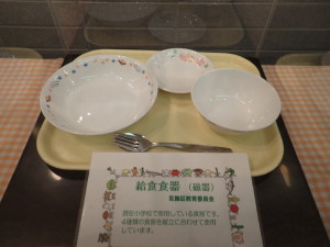 OLYMPUS DIGITAL CAMERA また、食器の変遷も展示してありました。 平成元年から軽量強化磁器を用いており、4種類の食器を献立に合わせて使用しています。 洋食のカトラリーはフォークとスプーン。 先割れスプーンではありません。